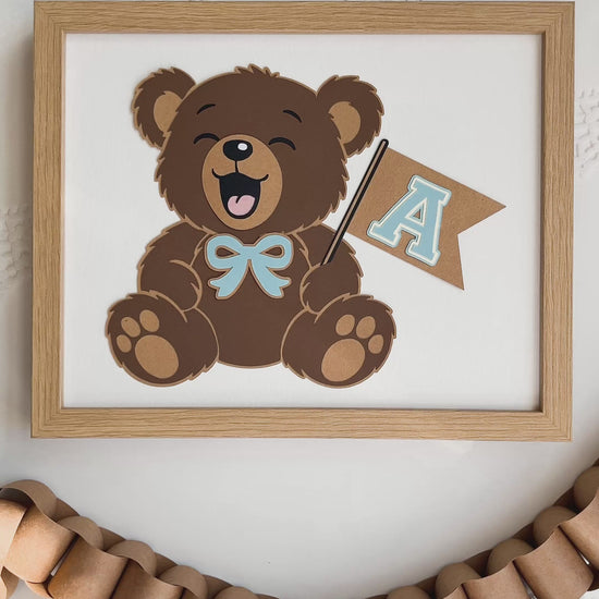 This sweet teddy bear art is made from carefully layered paper and personalized with the child’s initial on a little flag. You can choose both the letter and the letter and bow color, making each piece extra special. It’s framed and ready to gift, perfect for baby showers, birthdays, nurseries, and children’s rooms!